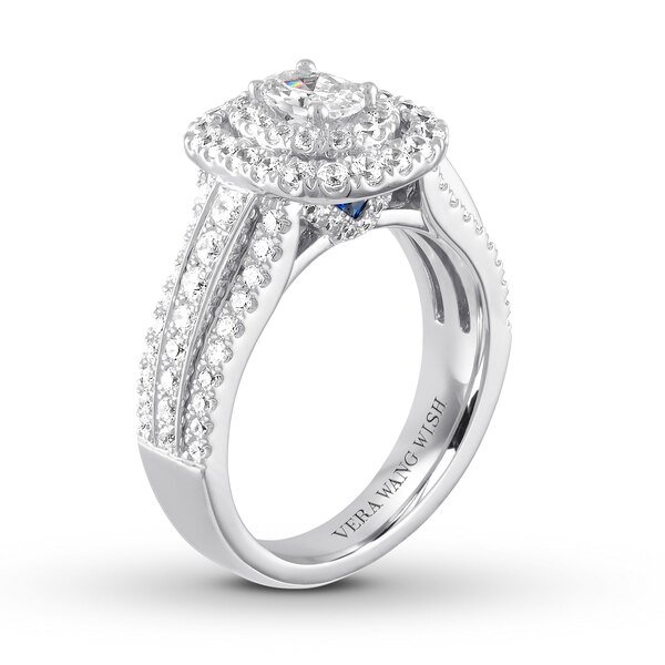 Brilliant round diamonds sweep across the band and halo the dazzling 1/2-carat oval diamond center of this thrilling engagement ring. Princess-cut sapphires, the signature of the collection and a symbol of faithfulness and everlasting love, are set into the ring's bezel. With a total diamond weight of 1 3/8 carats, the 14K white gold ring is a brilliant beginning to your romantic love story.